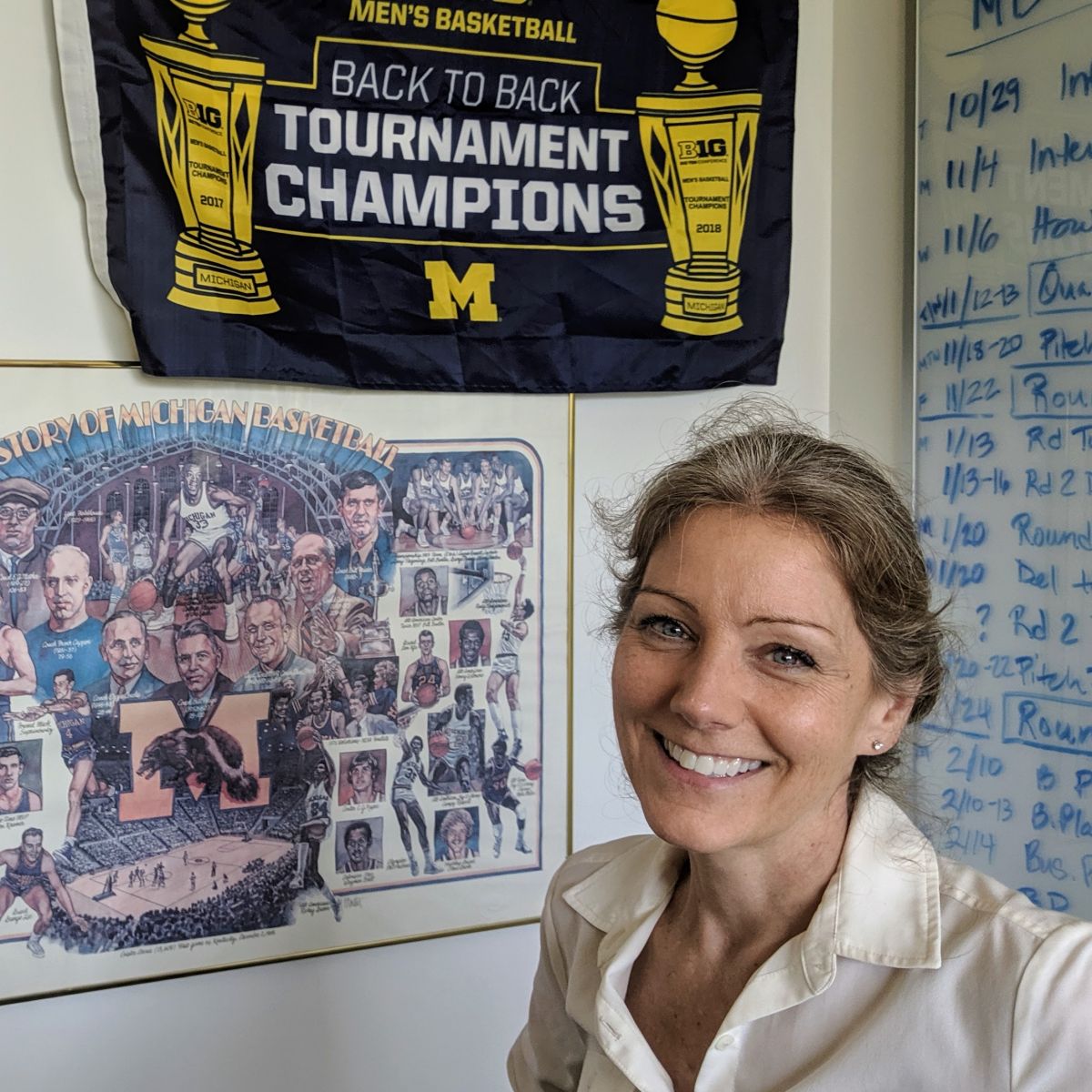Team posters, banners and other Michigan basketball memorabilia provide a colorful theme for the decor of Anne Perigo's office at the Ross School of Business. It is perhaps not too surprising that an Ann Arbor native who graduated from Pioneer High and has a BBA from the University would be an enthusiastic fan of the hoops team and of both departing coach Beilein and incoming coach Howard.